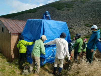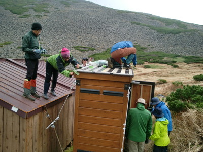 前日までの雨の影響で登山道はドロドロでしたが、点検・清掃作業完了しました。避難小屋までは気温、湿度共に快適でしたが、作業中にはガスがかかり、気温も下がり休憩中は寒さを感じるほどでした。特に目立った汚れもなく綺麗に使用されていました。利用者に声かけをしてトイレ事情をお聞きしました。携帯トイレ持参がほとんどで、ブースを利用している方が多かったとの情報でした。不携帯の方にもお話を聞き、トイレは穴を掘ってしているとの声もありましたが、携帯トイレを携帯し、利用していただくことと、私たちの様な活動を知ってもらえるようお話しました。(報告:高杉有里さん) |