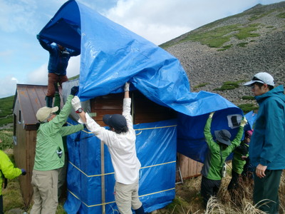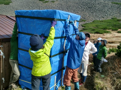 ・ブースの冬囲いも実施。参加者:美瑛町2人。美瑛山岳会3人。環境省3人。合計12人