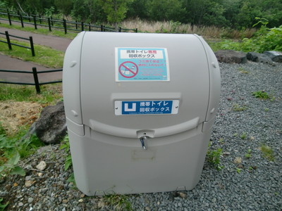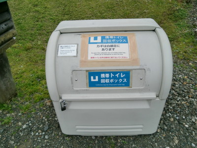 | 白金温泉の回収ボックス。施錠はダイヤルキー | 携帯トイレが2個しかなかった |