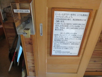 3.岩手山不動平(九合目)避難小屋トイレ 八合目避難小屋から約20分で九合目避難小屋(1830m)に到着。2005年度に整備。八合目避難小屋の管理人が管理している。小屋内はきれいでゴミ一つない。男女共用の洋式トイレ2室。八合目トイレと同じように使用済トイレペの回収箱が置いてあります。非水洗。臭いなし。協力金箱がありました。 |