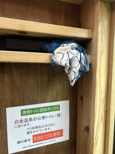 携帯トイレ回収ボックスが見当たらなかったため近くでちょうど清掃作業をしていた方に確認したところ、すでに撤去されたとのことでした。 (報告:水谷亮司さん) (特記)9月25日、山のトイレを考える会で美瑛町に問い合わせしたところ、先日の暴風雨で回収ボックスが100mほど飛ばされ、捜索のうえ発見。現在は設置済みとのことでした。 |