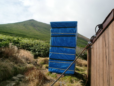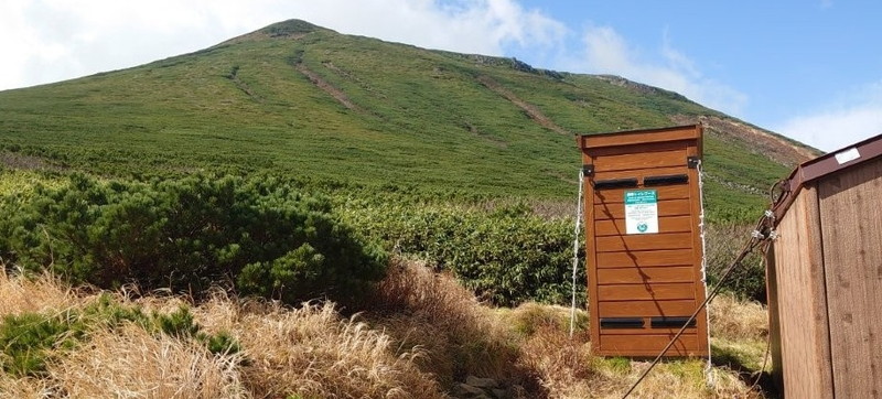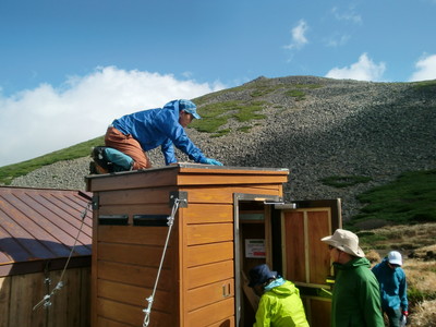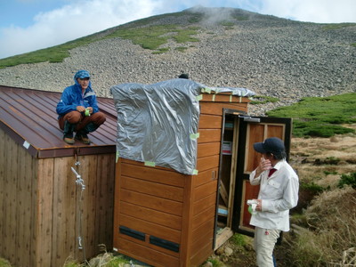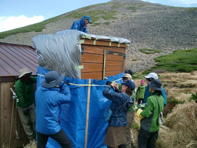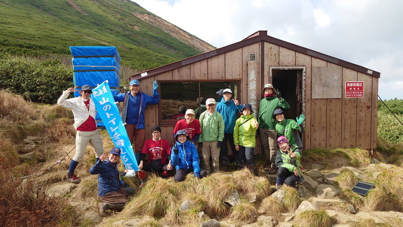 前日までの雨の影響で登山道はドロドロでしたが、点検・清掃作業完了しました。避難小屋までは気温、湿度共に快適でしたが、作業中にはガスがかかり、気温も下がり休憩中は寒さを感じるほどでした。特に目立った汚れもなく綺麗に使用されていました。利用者に声かけをしてトイレ事情をお聞きしました。携帯トイレ持参がほとんどで、ブースを利用している方が多かったとの情報でした。不携帯の方にもお話を聞き、トイレは穴を掘ってしているとの声もありましたが、携帯トイレを携帯し、利用していただくことと、私たちの様な活動を知ってもらえるようお話しました。(報告:高杉有里さん) |